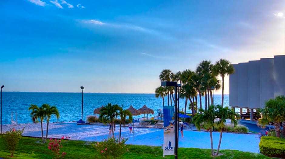 This spacious studio features a private balcony with a sunset view of Tampa Bay and pool view. A kitchen, separate living area, and laundry services are also included.